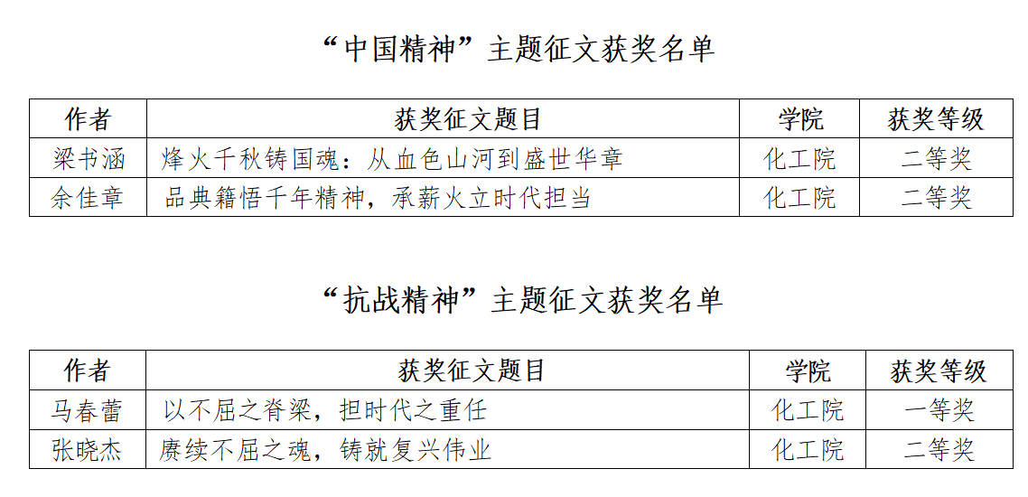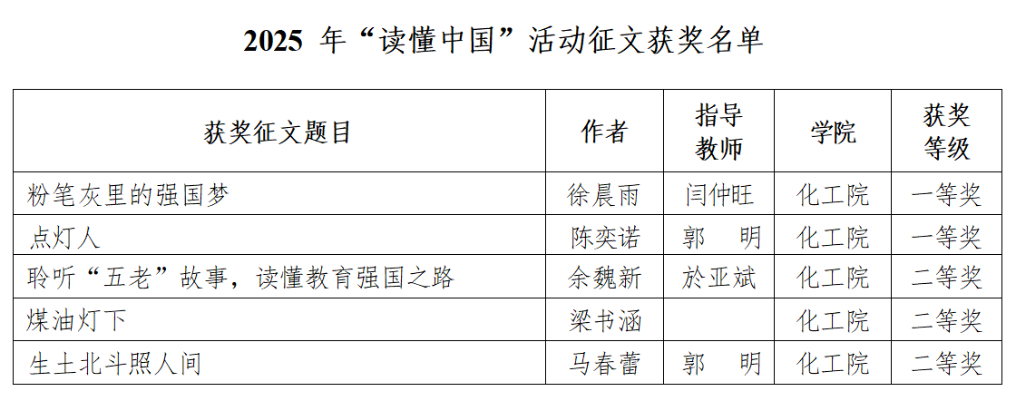 近日,南京林业大学关心下一代工作委员会公布了2025年"读懂中国"活动征文及"中国精神""抗战精神"主题教育征文获奖名单。化工院在活动中表现突出,共获得一等奖3项,二等奖6项,在"读懂中国"活动中学院关工委荣获"读懂中国"活动优秀组织奖。