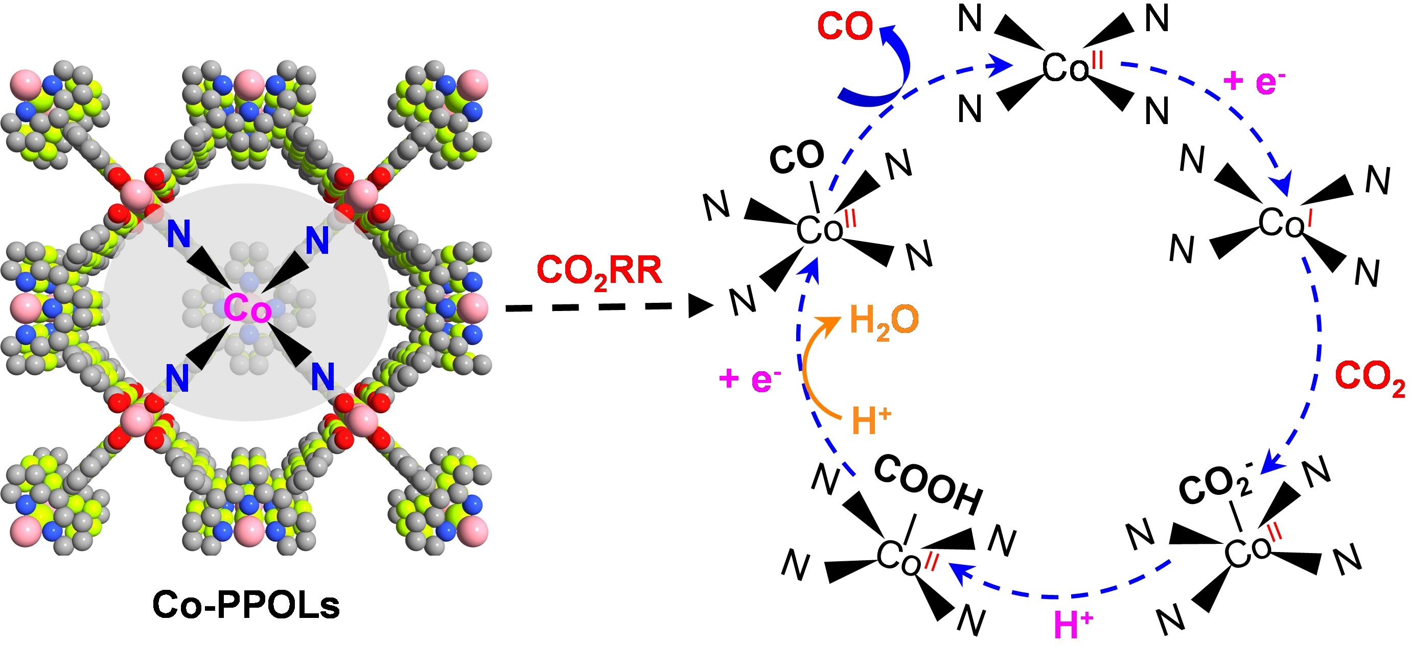 利用电催化CO2还原反应将CO2转化为高值含碳化合物引起了科研者的广泛关注。其中,CO产物作为费托合成技术的原料具有重要的应用前景。然而,催化剂在CO2电还原过程中面临着低活性、选择性和稳定性的问题。基于此,南京林业大学陈祖鹏教授团队通过自下而上的自组装策略,构筑了一种二维钴基多孔卟啉纳米层(Co-PPOLs)催化剂,用于CO2电还原反应,表现出优异的催化性能。此外,利用膜电极装置降低传质影响,进一步评估Co-PPOLs在工业级大电流下的电催化CO2还原性能。在不冲洗电极或更换电解质的情况下,Co-PPOLs在长时间工业大电流的催化驱动下,可保持趋近90%的CO法拉第效率值。该工作为设计非贵金属单原子催化剂用于商业化规模的CO2电还原提供了一种新策略。