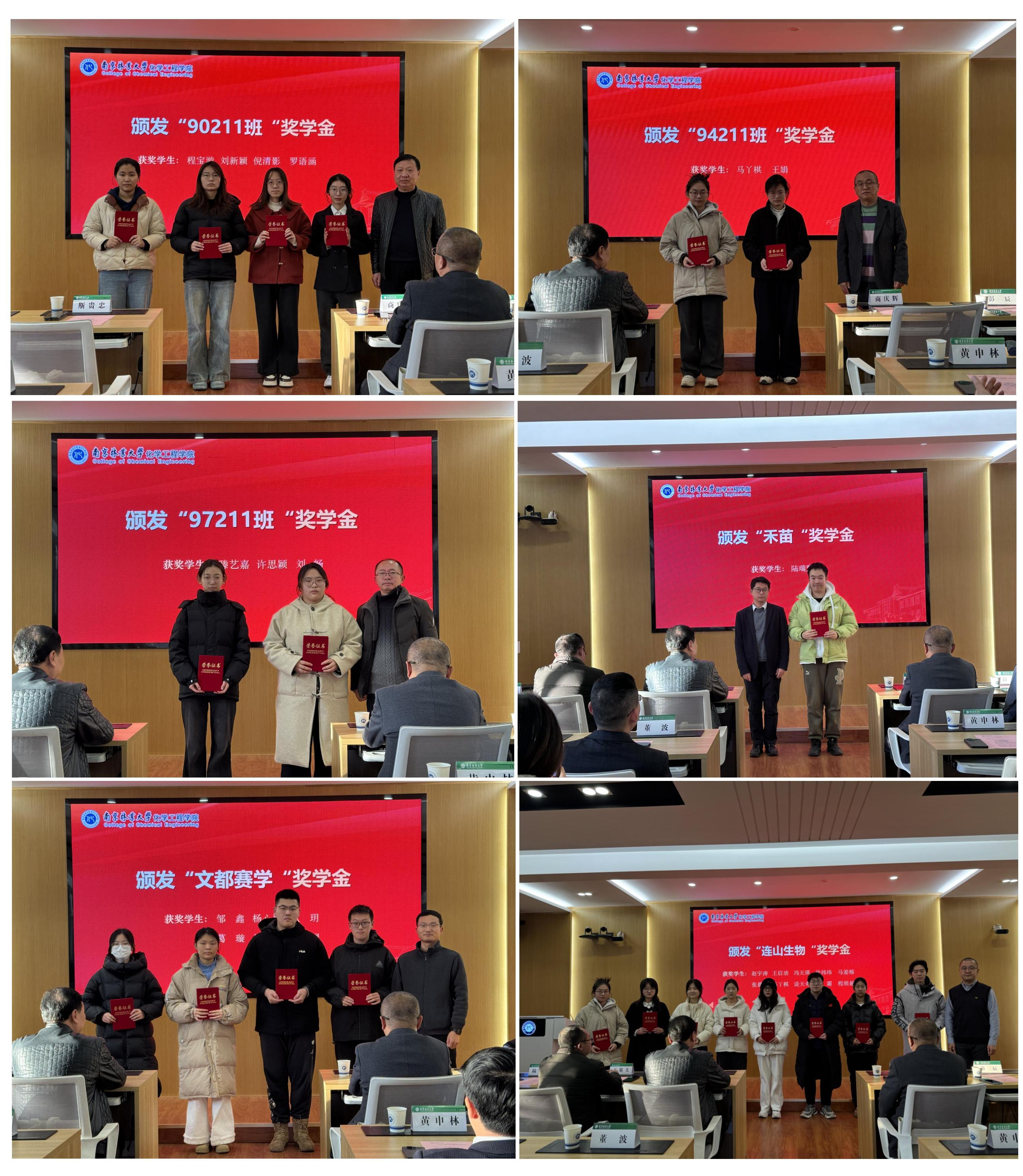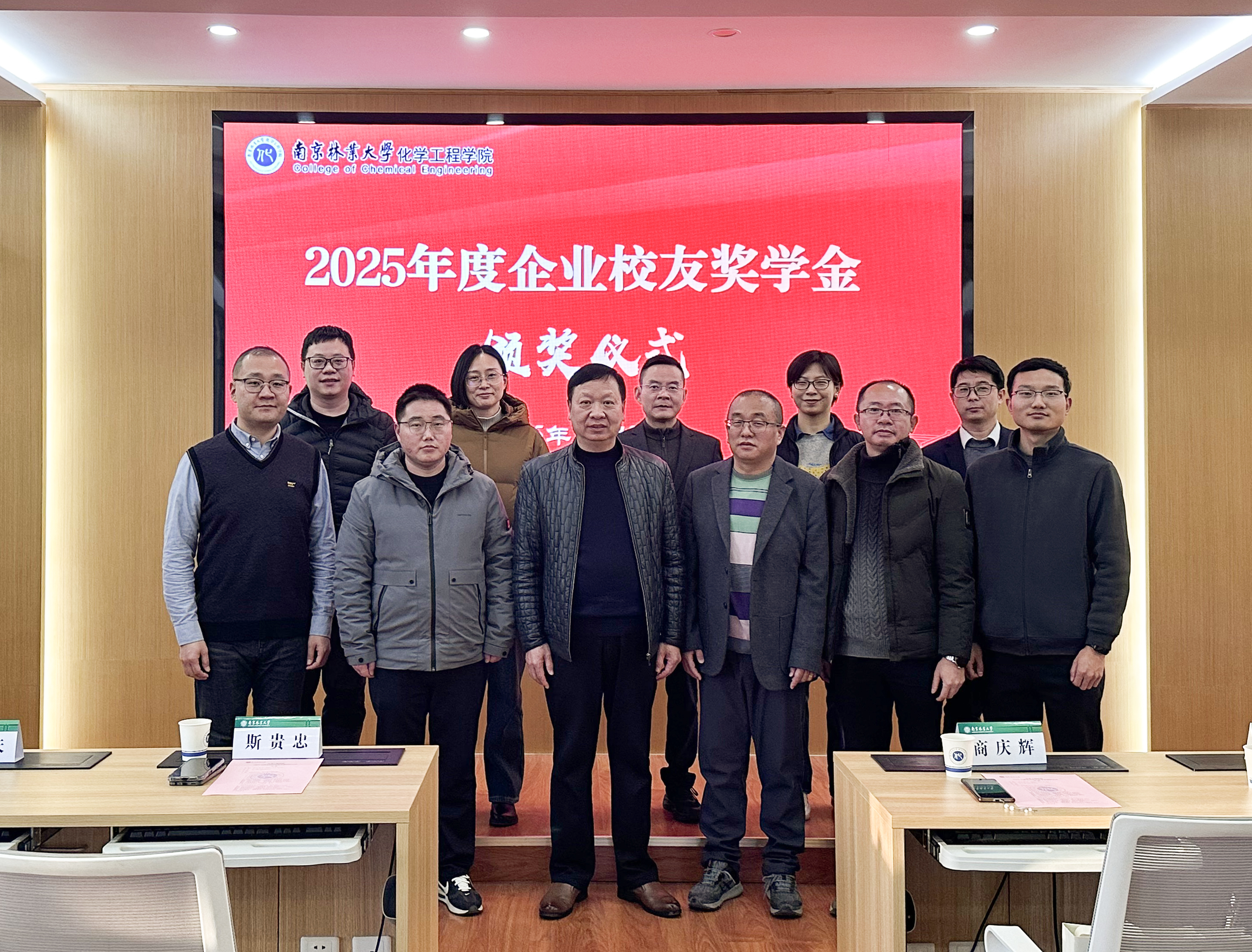 12月25日下午,学院在化工楼2400报告厅隆重举行2025年度企业校友奖学金颁奖仪式。90级校友斯贵忠、94级校友商庆辉、97级校友王基夫,南京连山生物科技有限公司总经理彭辰、南京擎宇生物医药科技有限公司副总经理陆林华、海南文都赛学教育科技有限公司经理蒋刚,院党委副书记、副院长董波,副院长黄申林、徐徐、荆宇,林产化学与材料国际创新高地运行办公室副主任黄曹兴,以及获奖学生代表共同出席活动。仪式由院团委书记、学工办主任张燕主持。