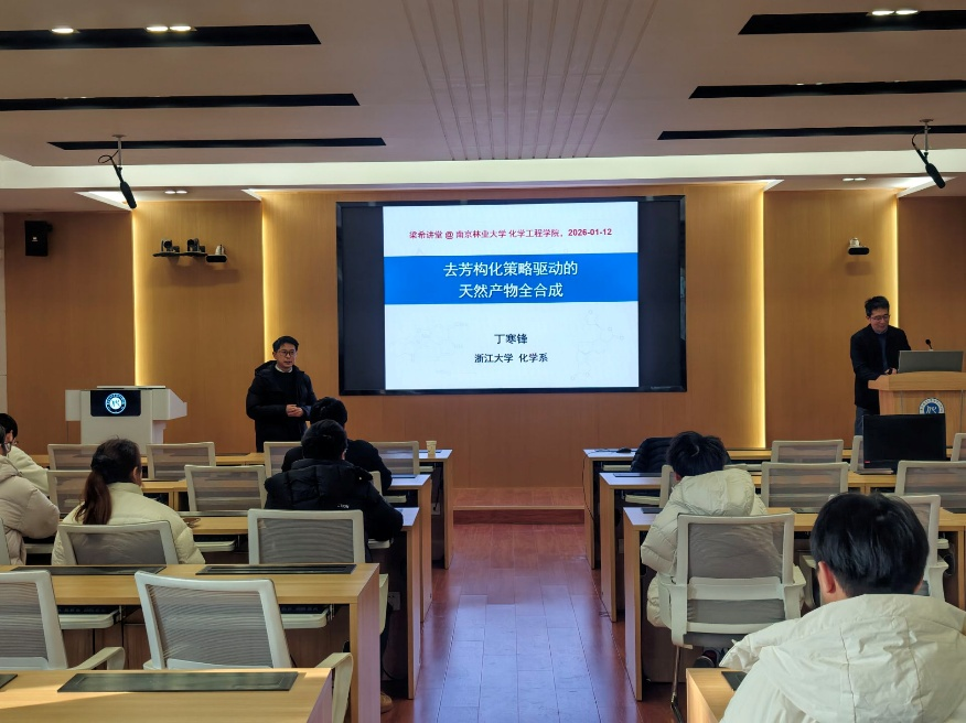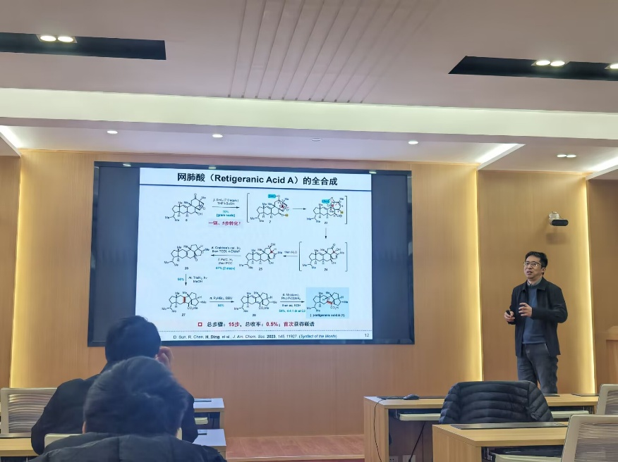 2026年1月12日下午四点,浙江大学丁寒锋教授应邀来我院2400报告厅展开学术报告,报告以“去芳构化策略驱动的天然产物全合成”为主题,通过三类天然产物全合成的代表性工作,系统性阐述了丁教授课题组在天然产物发散性合成领域的前沿研究。