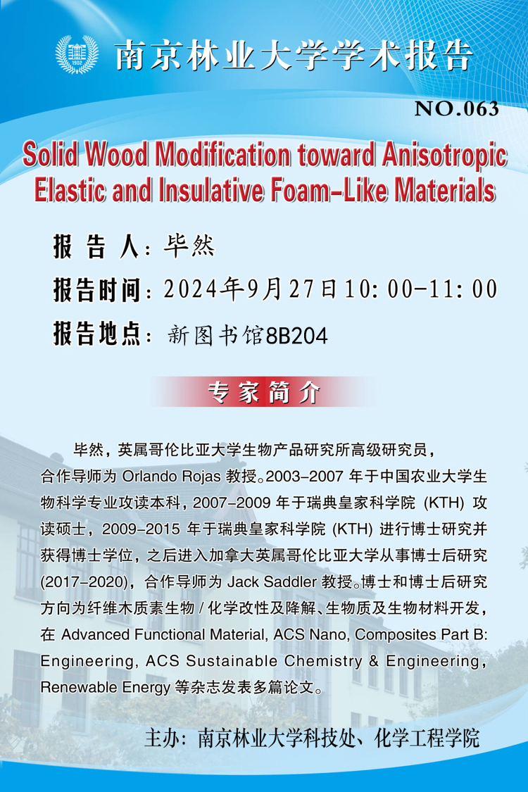 学术报告127:Solid Wood Modification toward Anisotropic Elastic and Insulative Foam-Like Materials